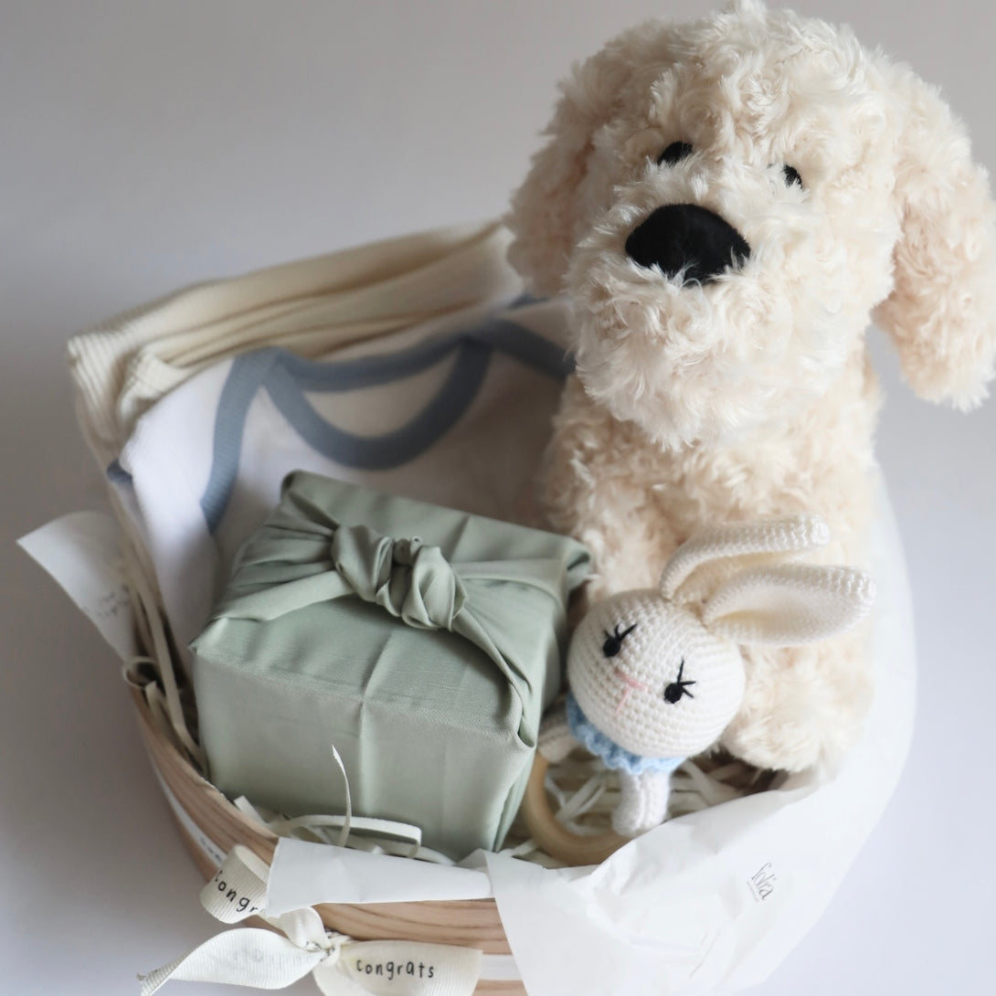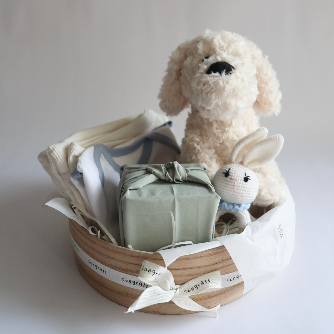 This round basket for new mom includes a fabric box filled with delicious brownies, a romper by luna care, a toy by plushie pals, a baby rattle, swaddle blanket and a greeting card. The perfect gift to welcome the newest addition to the family!