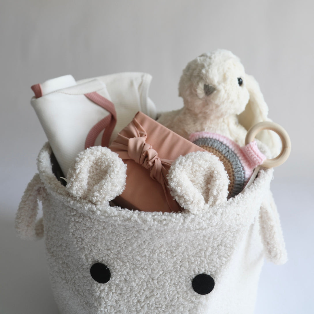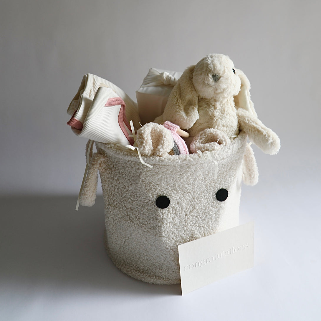 This bunny basket for new mom includes a fabric box filled with delicious brownies, a romper by luna care, a toy by plushie pals, a baby rattle, swaddle blanket and a greeting card. The perfect gift to welcome the newest addition to the family!