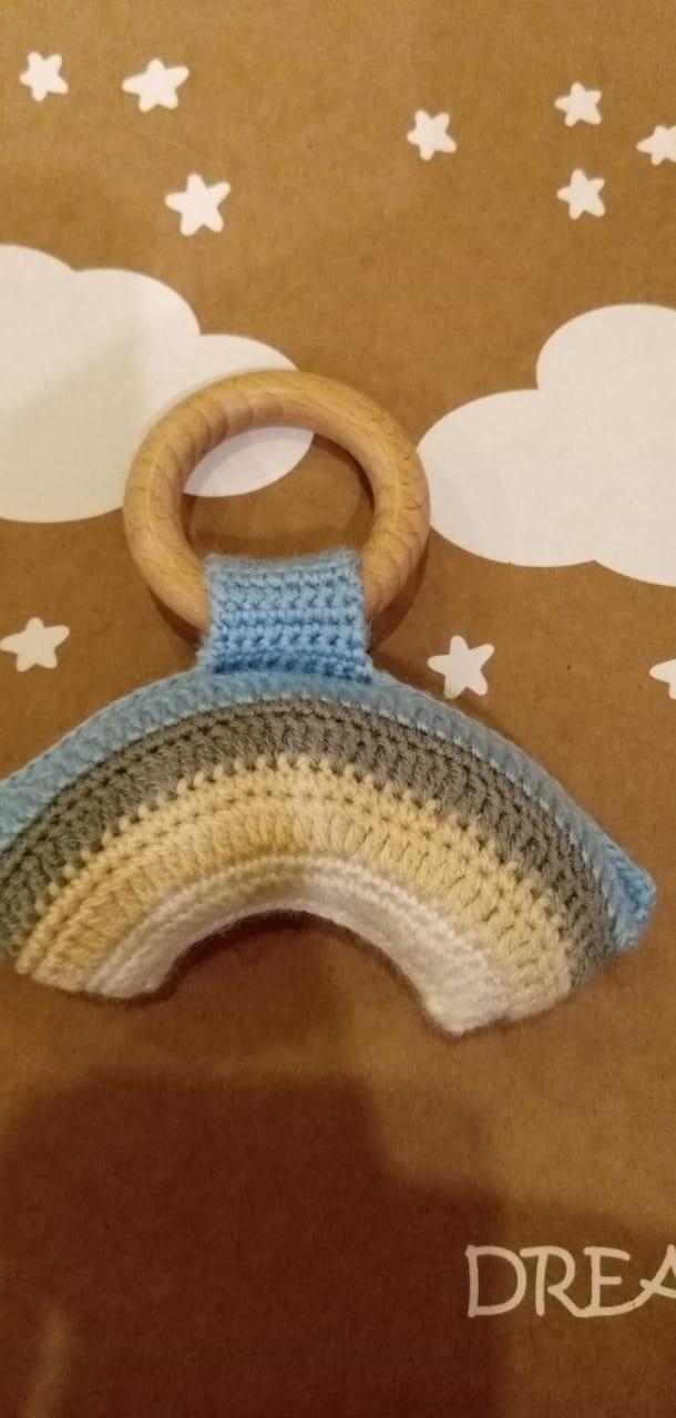 Bring a little bit of color to your little one's world with this delightful crochet rainbow rattle! Its soft, handcrafted shape makes it an ideal accessory for introducing babies to the joys of playtime with its fun crinkly and jingle sounds.
